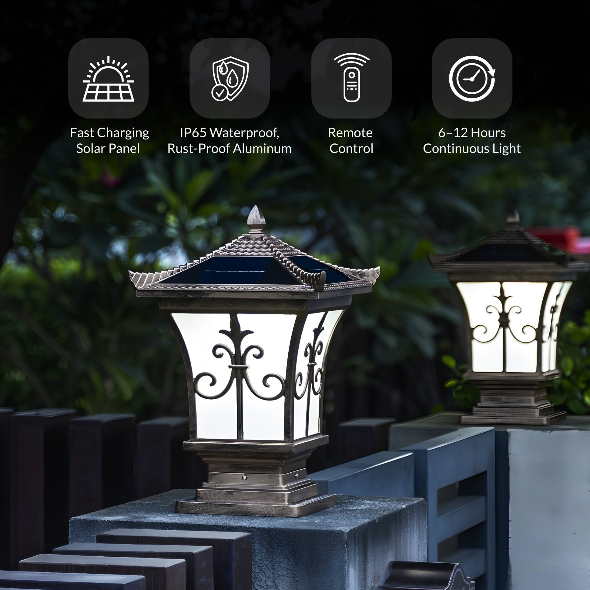 Pagoda Solar Powered Post Cap Light from Weslen Home features solar powered operation and a waterproof design. Ideal for outdoor fence posts and pathway lighting, this post cap light comes with a remote control for easy adjustments. It installs securely to standard posts, delivering reliable illumination suitable for various weather conditions.