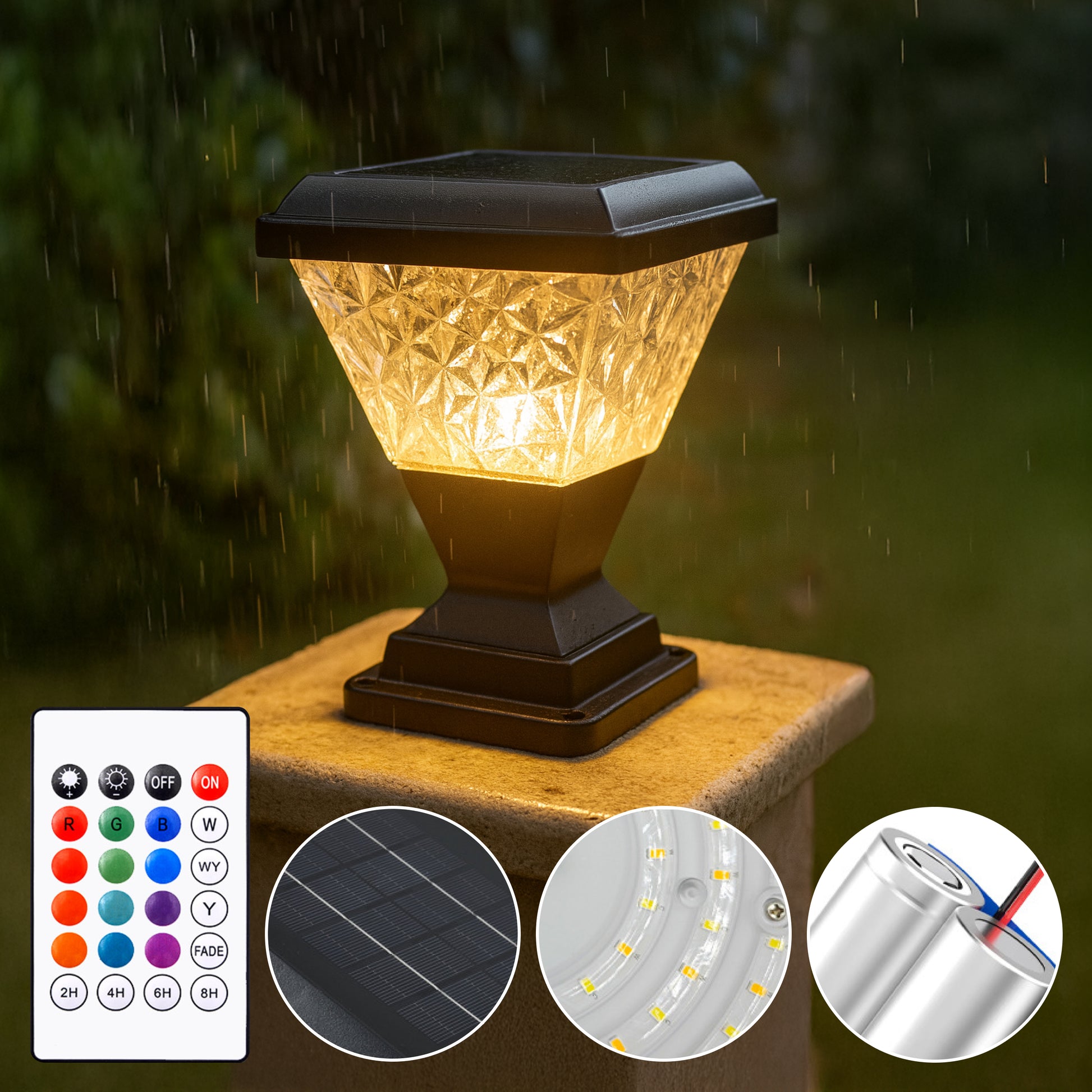 Facet Solar Powered Post Cap Light from Weslen Home features solar powered operation, a remote control for easy adjustments, and a waterproof design. Ideal for outdoor use on decks, patios, and fences, this post cap light offers reliable illumination without the need for hardwiring. It is built to withstand various weather conditions, making it a practical addition to your outdoor lighting setup.